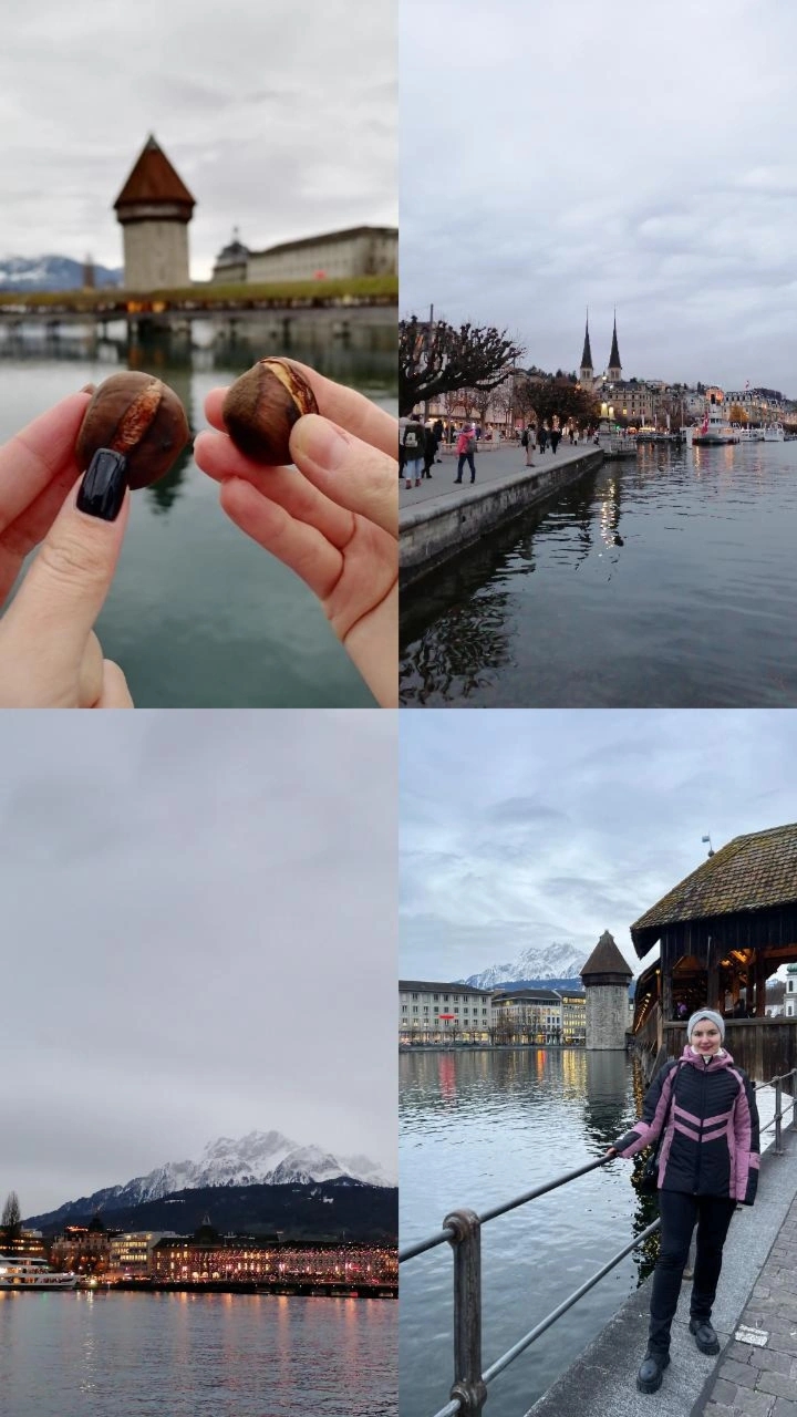 După m-am întors în Lucerna. Am mâncat castane coapte. M-am plimbat pe podul Kapelbrucke și am admirat munții reflectându-se pe suprafața lacului Lucerna. A fost atât de frumos, ca un tablou de iarnă. Părea ireal.