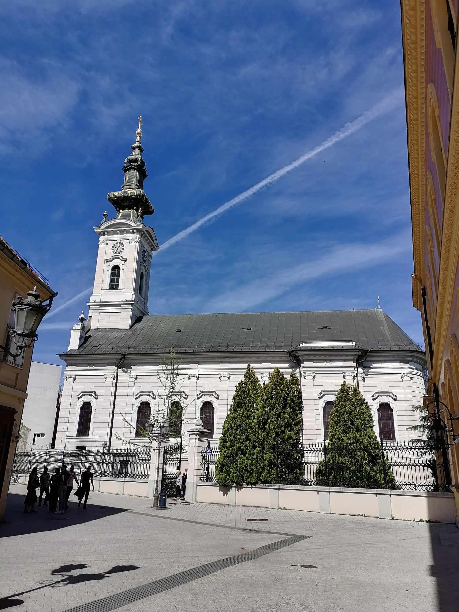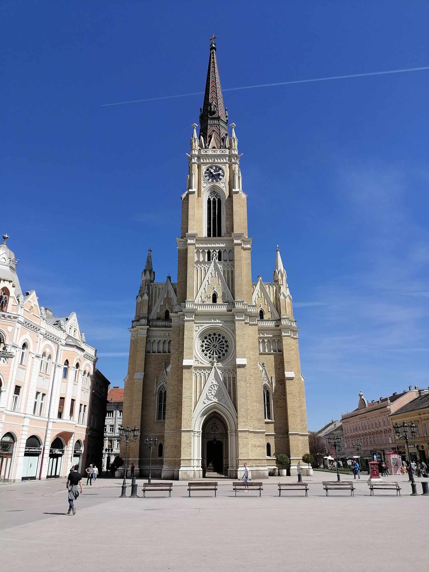 După sesiunea de cumpărături, am admirat clădirile de pe strada Kralja Aleksandra. Culorile plăcute și detaliile de pe fațade m-au făcut să mă opresc ca să le privesc pe îndetele. În continuare am ajuns în Piața Libertății (Trg Slobode) la catedrala romano-catolică. Exteriorul m-a impresionat.