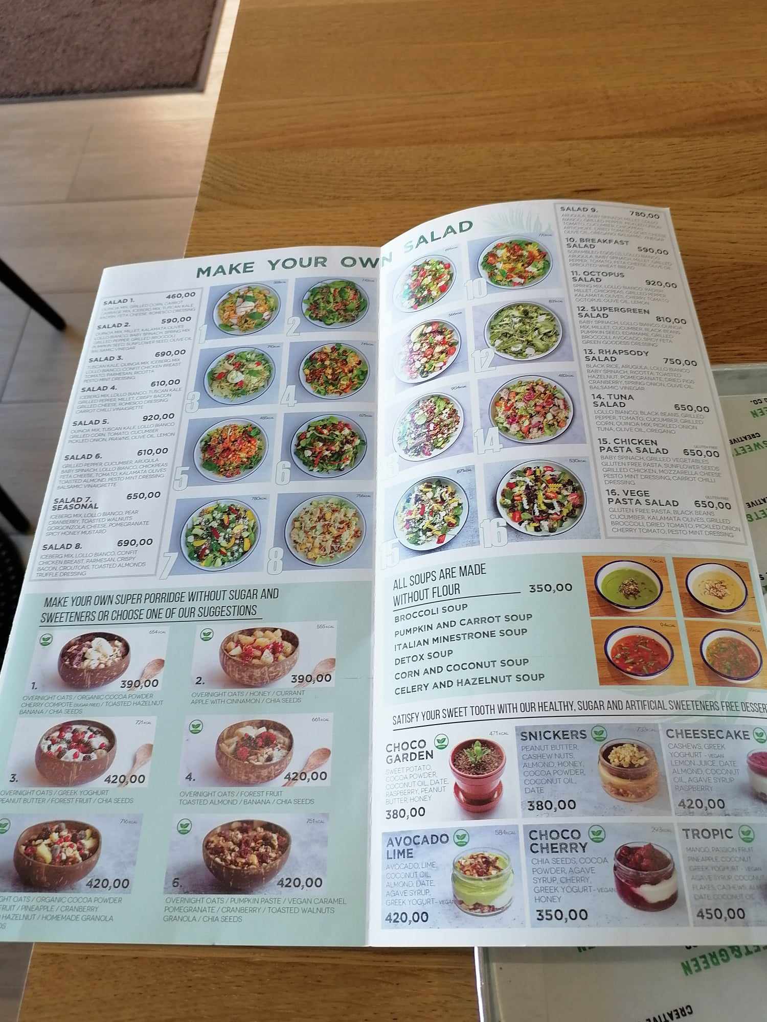 Meniul lor conține salate (vegane, vegetariene, cu proteină (animală/vegetala), legume, sosuri), deserturi (cu fulgi de ovăz, nuci, migdale, unt de arahide, fructe de pădure și îndulcitori naturali), dar și smoothi-uri. Dacă vrei să mănânci ceva sănătos și gustos, aici e locul ideal.