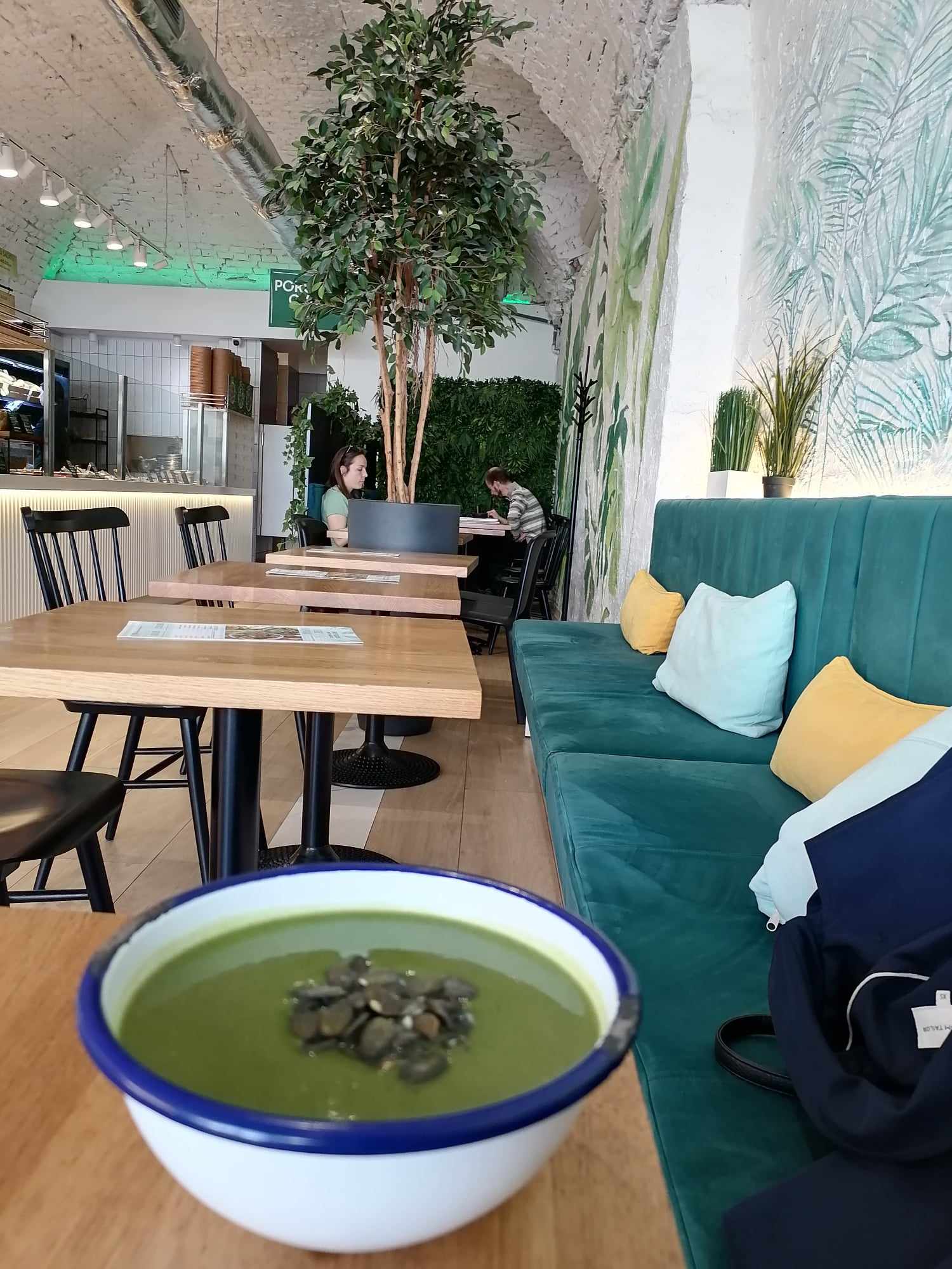 Era deja prânzul, mi se făcuse foame și țineam post, însă am găsit un loc perfect: Sweet & Green. Eu am ales o supă de brocoli cu semințe care costat 350 de dinari (15 lei) și o porție de biscuiți din semințe (90 de dinari = 3,8 lei).