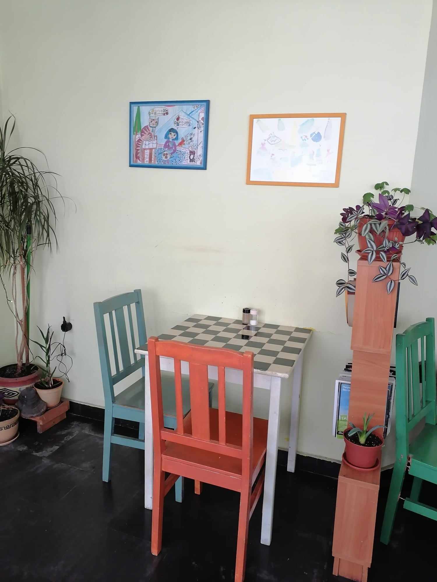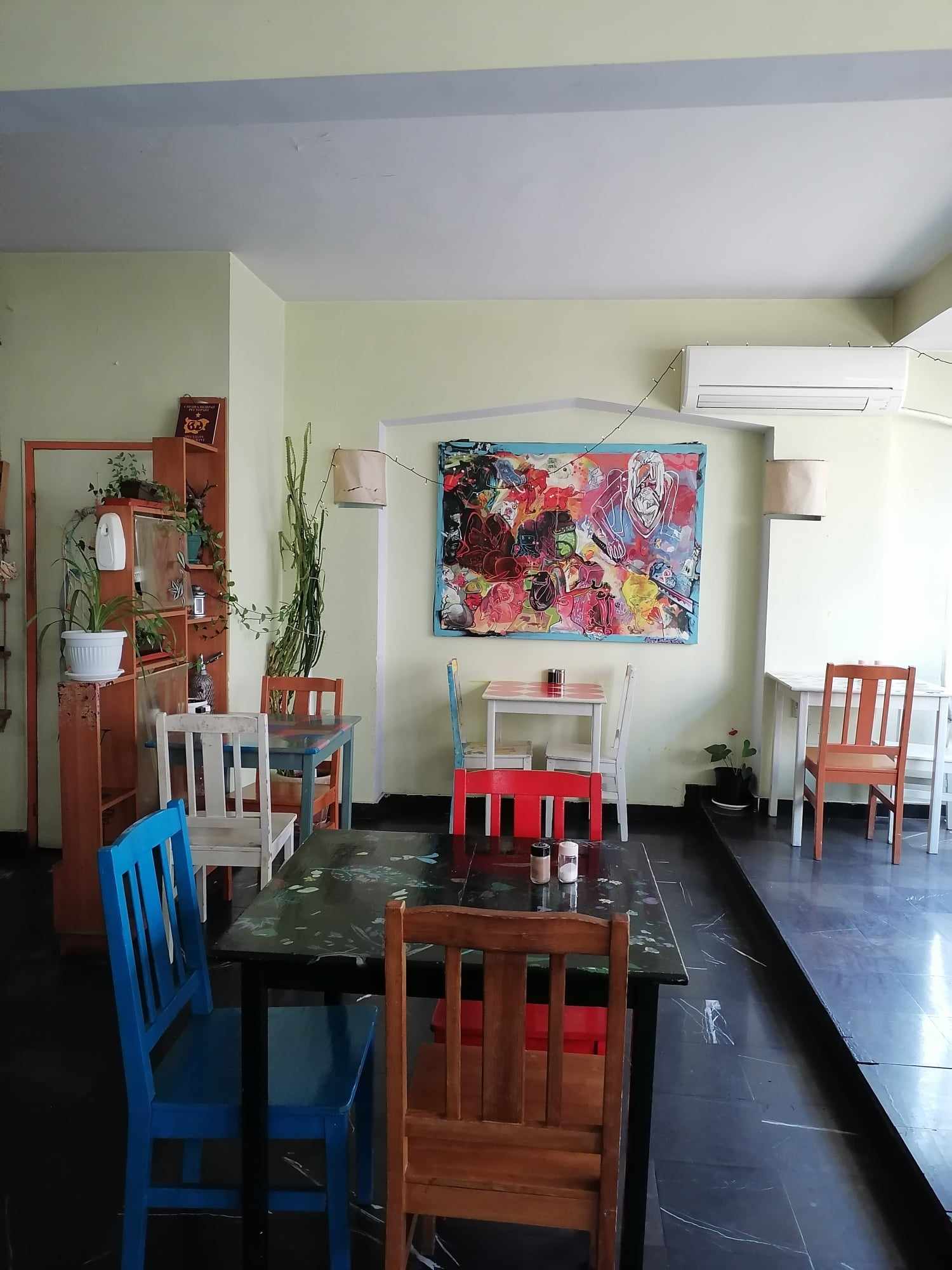 Era gol când am ajuns ceea ce mi-a plăcut pentru că era liniște. Interiorul era drăguț, cu tablouri, plante, scaune și mese colorate.