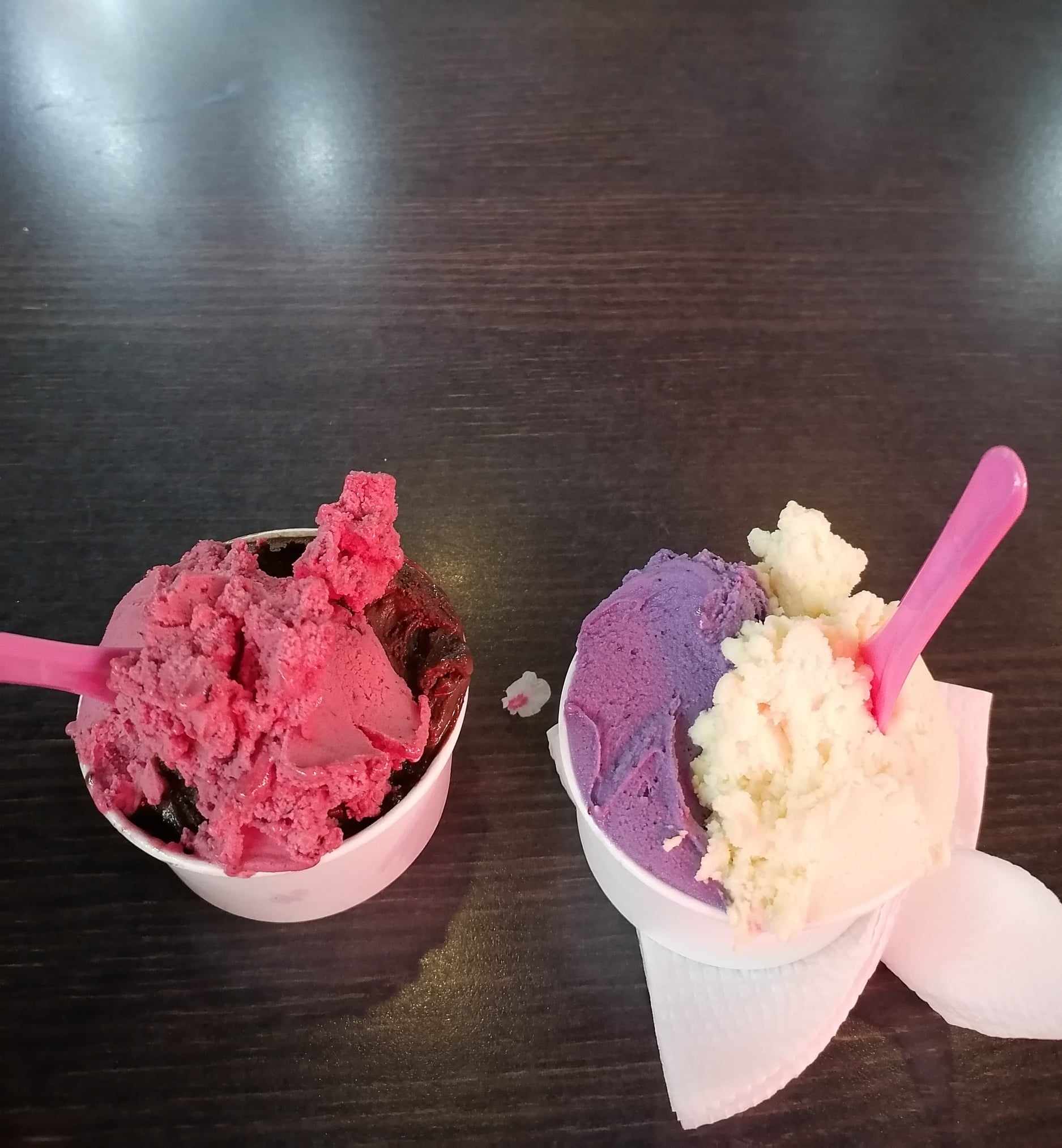 Mi-au plăcut toate, dar cea mov (cred că de struguri) a fost ceva de vis. Nici cea cu cioco neagră nu s-a lăsat mai prejos (mai ales că avea bucăți de ciocolată înăuntru), iar cea cu mango și ananas a fost o combinație delicioasă pe care nu am mai încercat-o până atunci. Cea cu căpșuni a fost clasică, dulce și bună. Mai aveau și cu lămâie, tot vegană și fără zahăr.