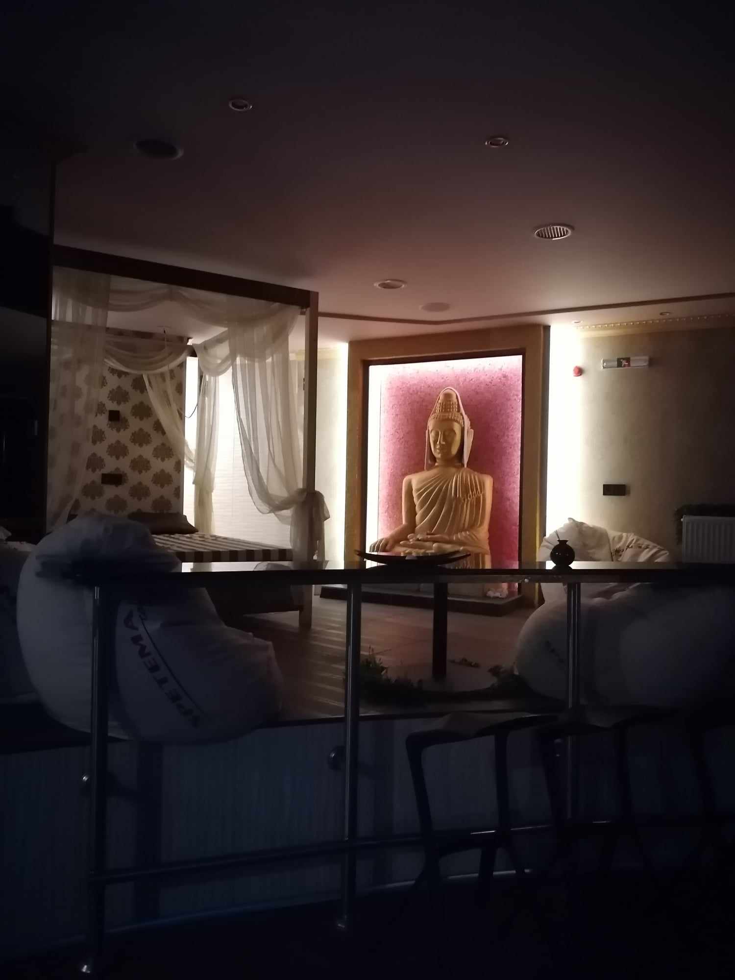 Au aici baldachinele drăguțe care m-au făcut să mă simt ca o Cleopatra, o statuie cu Budha care m-a dus cu gândul la yoga și muzică liniștitoare pe fundal. De asemenea, camera pentru fumători este în exterior, iar fumul nu ajunge la nefumători. Se pot comanda narghilea sau băuturi de la recepție.