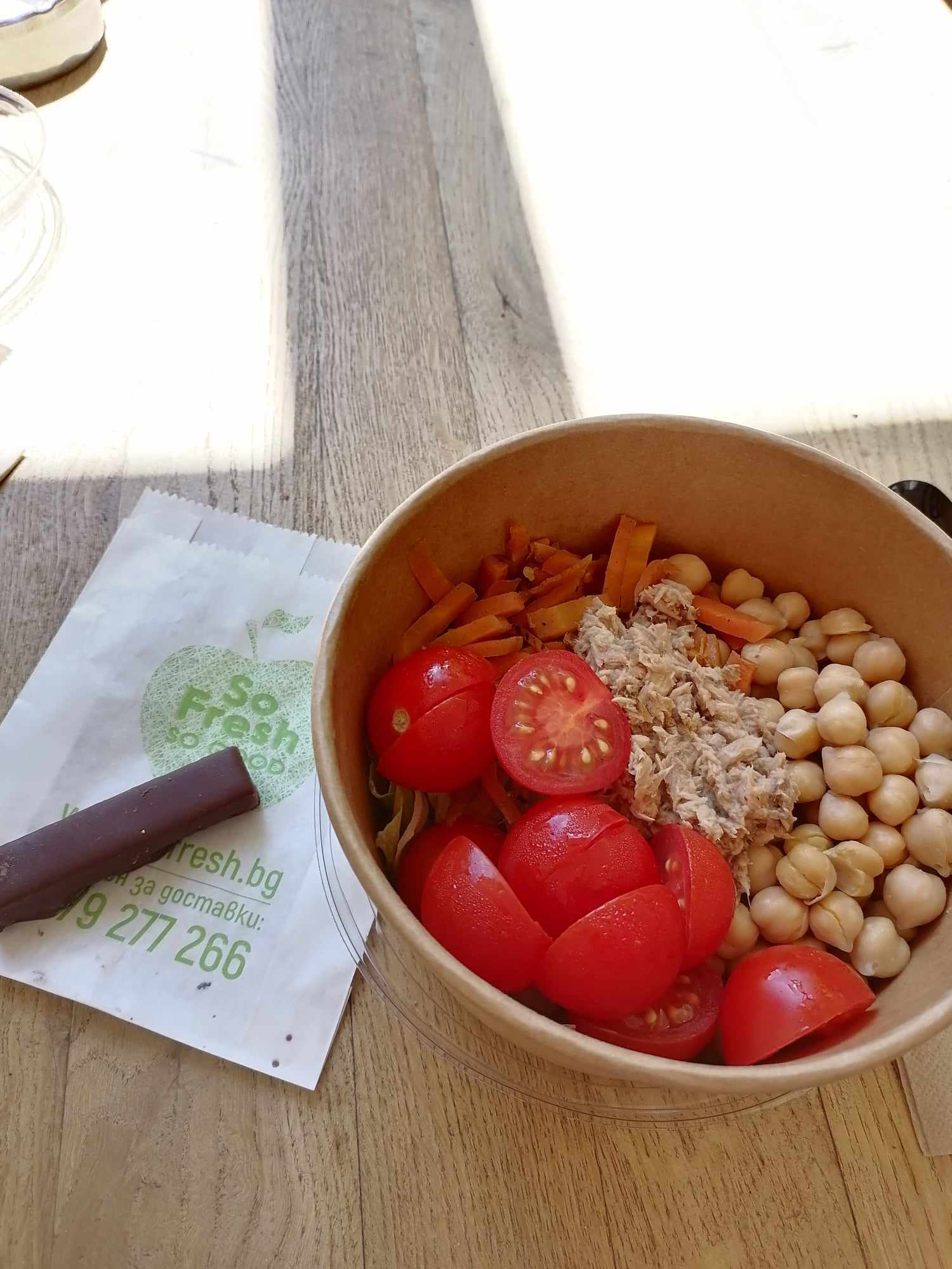 Am mers în duminca Floriilor când era dezlegare la pește așa că am ales o salata și sandvișul cu ton. Au și variante cu pui sau vegane (cu orez, legume, quinoa). Ca desert au torturi, batoane snickers și biluțe proteice, cu cocos, fără zahăr. Eu l-am încercat pe cel cu cocos.