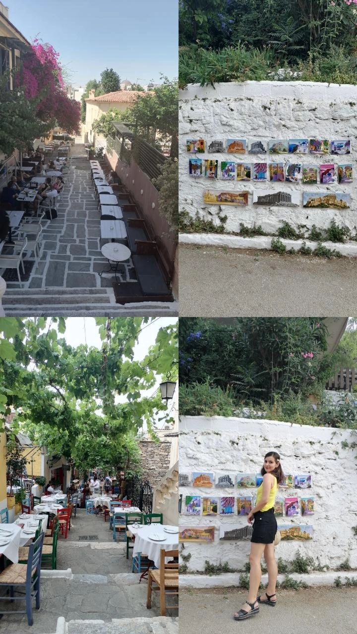 Anafiotika este cunoscut pentru strada Mnisikleous pe ale cărei trepte se așează turiștii și localnicii seara. Mie mi-a plăcut mai mult strada Prytaneiou pentru că acolo sunt expuse tablouri ale unui pictor local. Dacă vrei un exponat unic, poți achiziționa una din creațile sale sau face poze. Dacă Mnisikleous e prea aglomerată, mai e o stradă cu trepte, cafenele și restaurante – Erechteos.