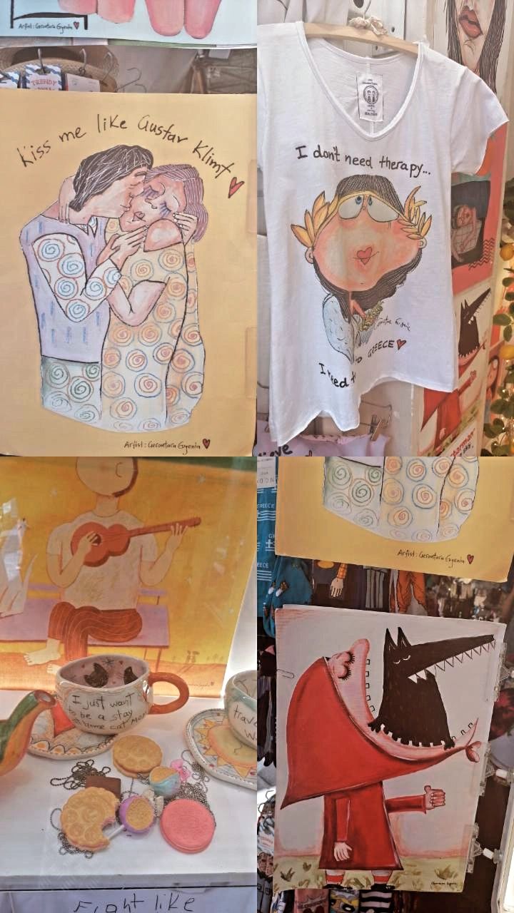 Mai sunt multe suveniruri drăguțe: opincile din lână tradiționale, rochiile de zeițe, coroanele de măslini ca accesoriu pentru păr, sacoșele cu zei cool și brelocurile în formă de organe genitale masculine (totul a pornit de la niște scene de amor de pe un vas grecesc).