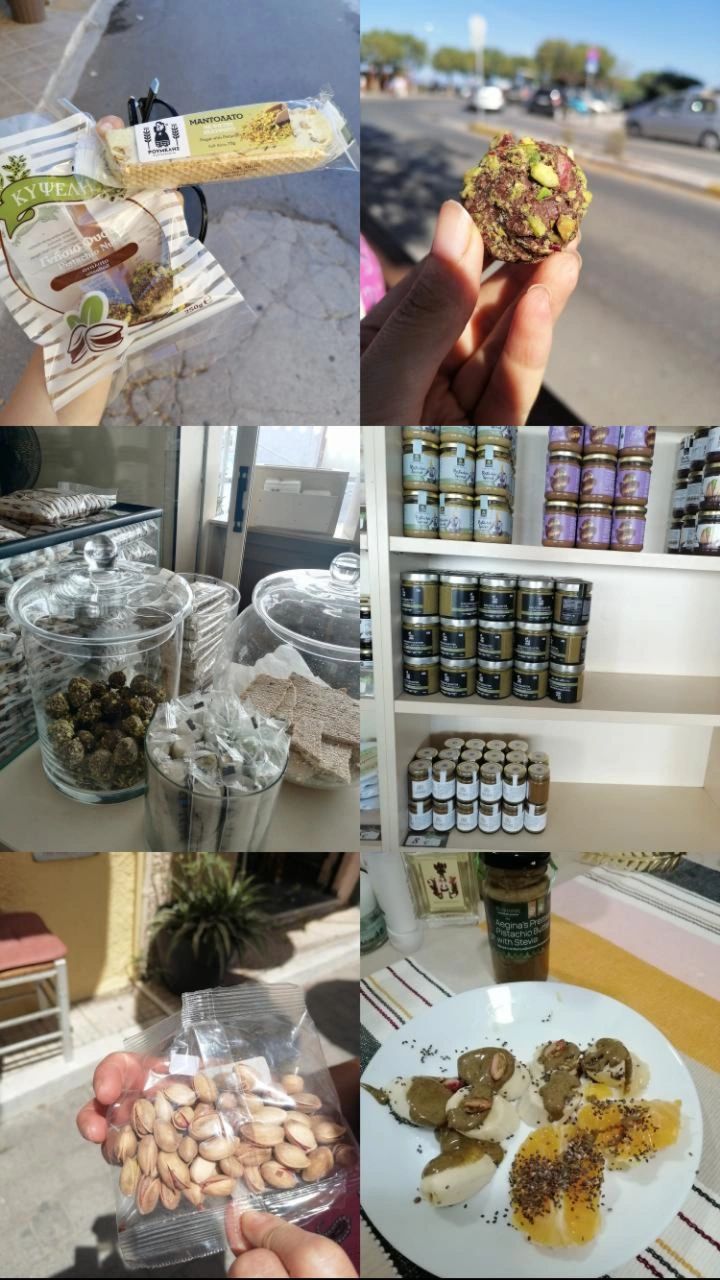 Insula Egina e cunoscută pentru fistic: gemuri, unturi, bomboane, halvițe. Au și variate fără zahăr. Eu am încercat bomboanele și halvița cu fistic de la Kipseli. Am mai luat și un unt de fistic îndulcit cu ștevie de la unul din multele magazine de pe faleză (care nu a mai ajuns la Severin pentru că l-am mâncat pe tot în concediu).