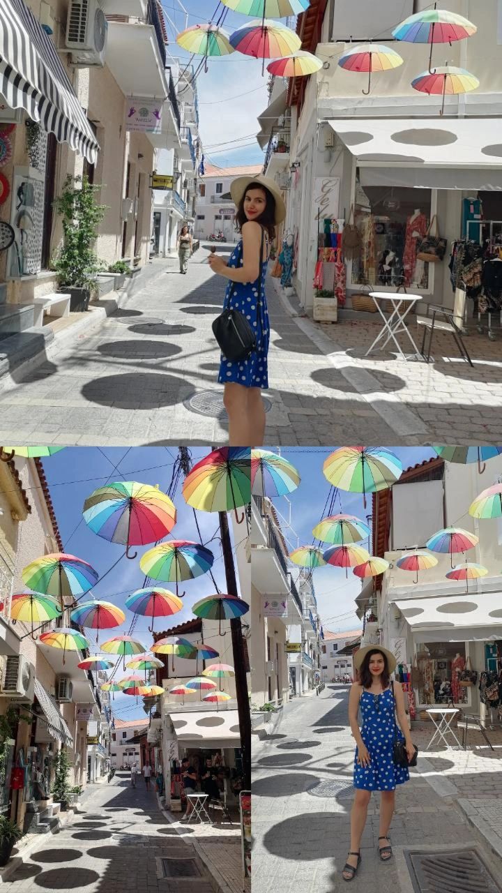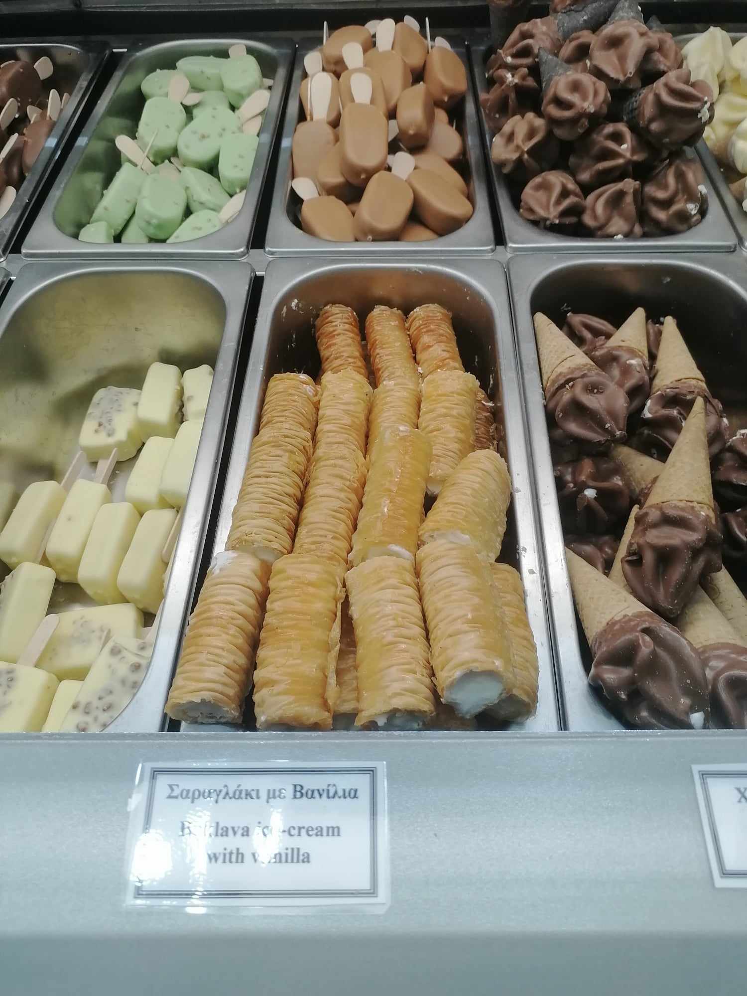 E plin de gelaterii pe insulă, așa că ai de unde alege. Am găsit inclusiv înghețată fără zahăr la Ρόδι coffee & snacks & more pe strada Ioulias Katsa, care are umbrele colorate.
