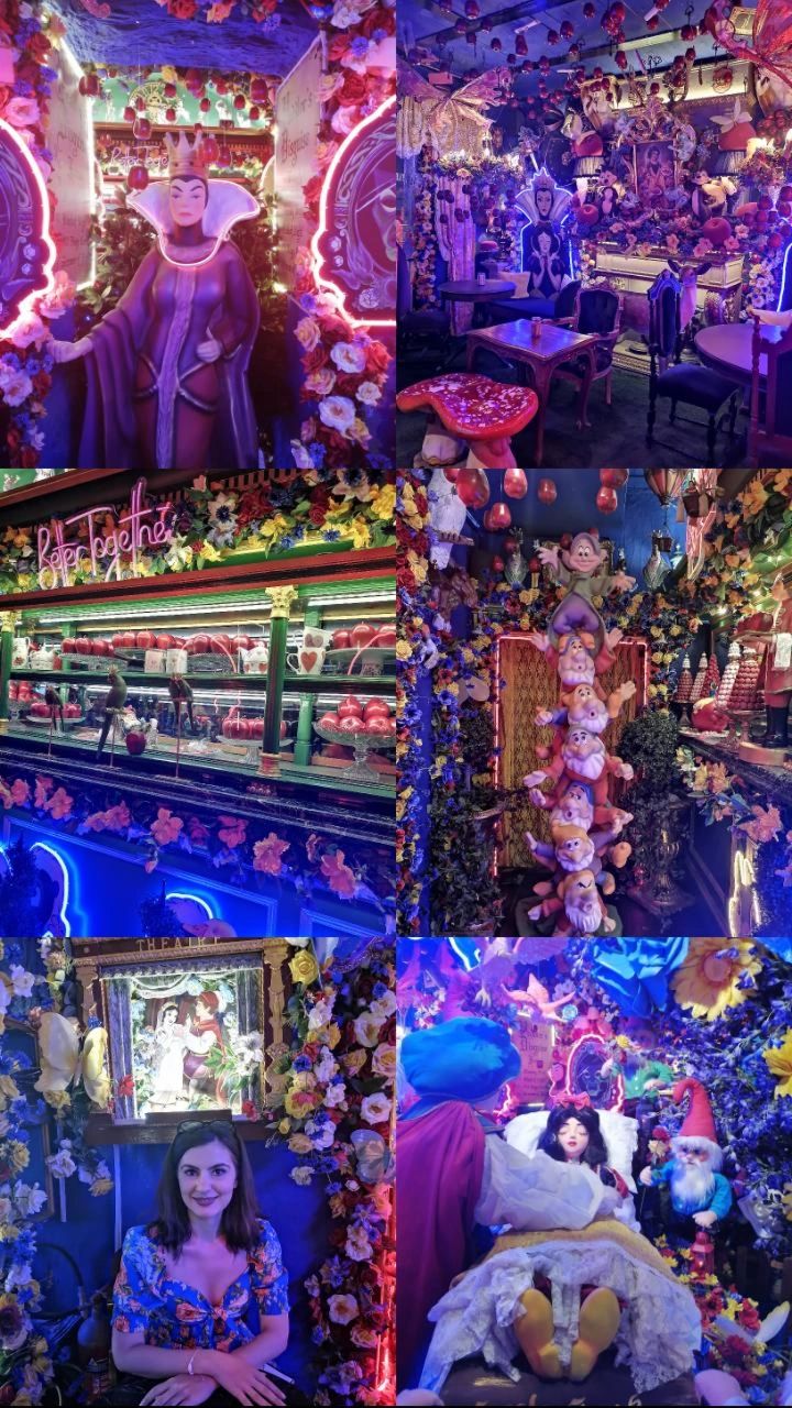 În general se stă afară, dar au mese și înăuntru. Interiorul e și mai spectaculor, cu o statuie a reginei celei rele și cu o scenă cu piticii adunați în jurul patului în care doarme Albă ca Zăpada.
