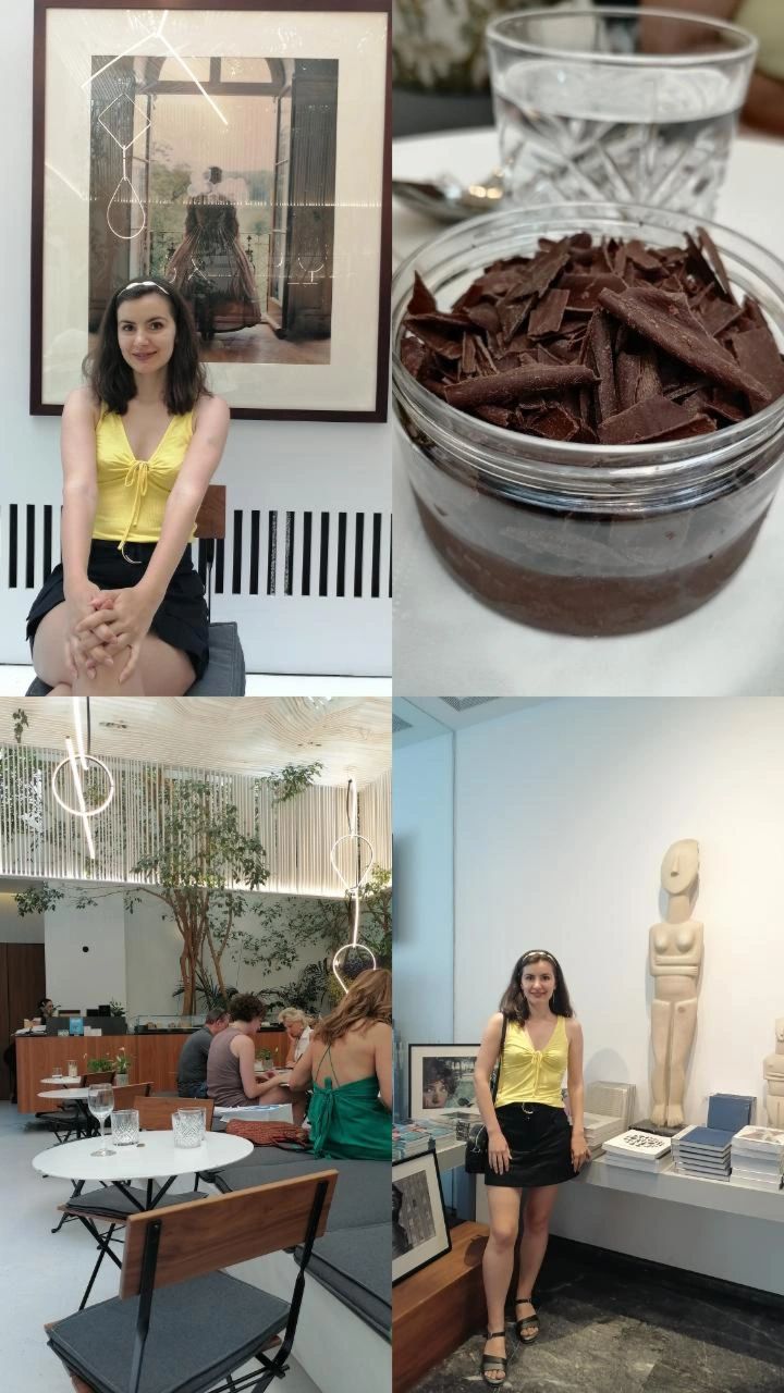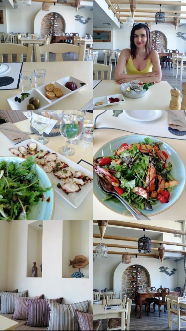 Restaurantul se deschide la ora 11 și are un design interior deosebit. Aici am încercat pentru prima dată striile crude. Am mai comandat o salată cu creveți și caracatiță pe grătar. Am primit din partea casei lichior de mastic pe care îl recomand. A fost dulce, aromat și rece (cu câteva cuburi de gheață).