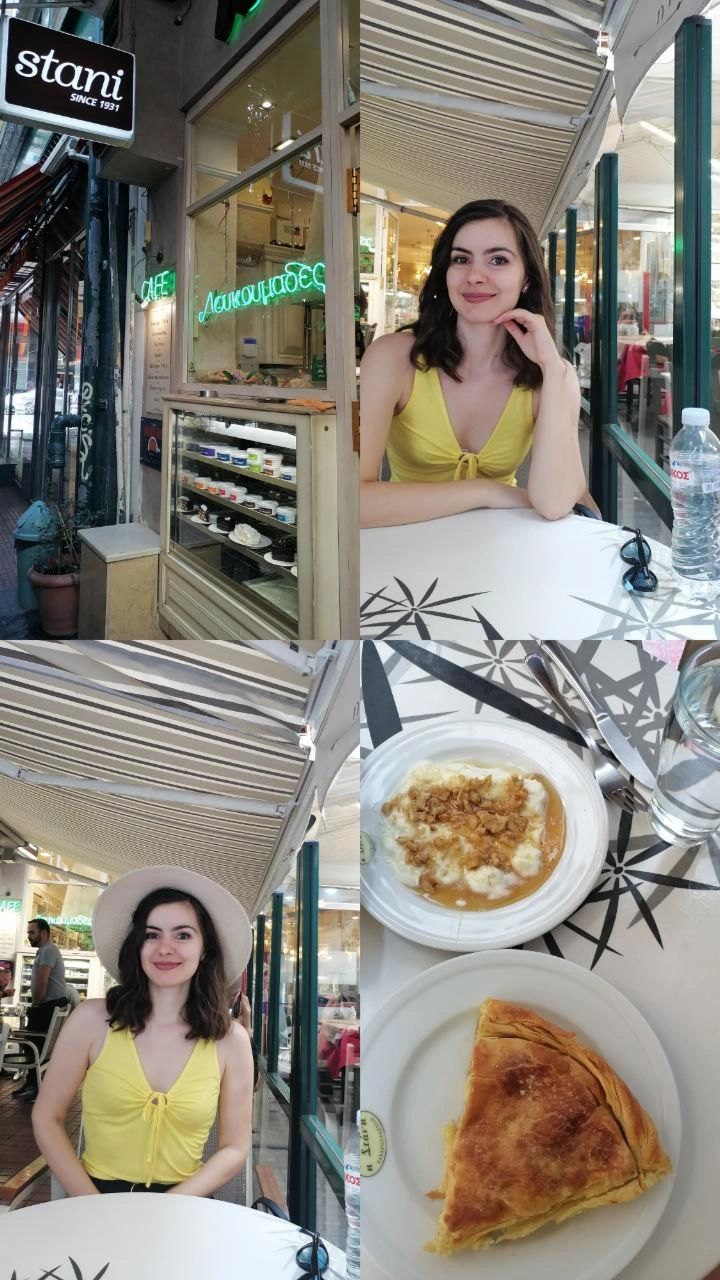 Așa mi-am început ziua, cu iaurt și plăcintă. Îl poți pregăti tu, cu produsele locale achiziționate de la piață sau supermarket sau servi în oraș. Atena e plină de patiserii care servesc plăcintă cu brânză. Un loc foarte popular este Stani, o patiserie cu tradiție deschisă în 1931. Este deschisă de la 7 jumătate dimineața până seara la 9 și e aproape de stația de metrou Omonia. Pe lângă cele 2 preparate cunoscute pe care chelnerii le recomandă, mai au și alte, iar cafeaua grecească e bună.